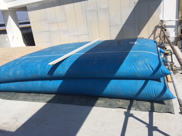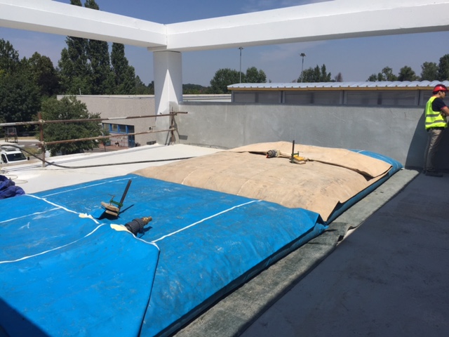 Prove di carico su solai con formazione del carico mediante gommoni in PVC e verifica degli abbassamenti trasduttori di spostamento analogici.